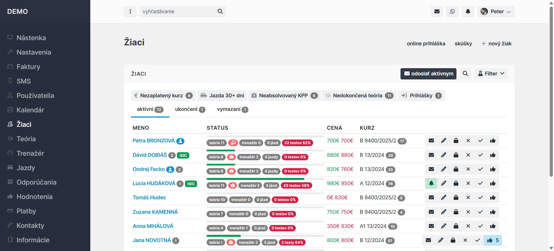 Ako prvé so prihláste do aplikácie jazdy.sk. Hneď potom prejdite do sekcie Žiaci. Na obrazovke sa zobrazia všetci žiaci, základný status absolvovania kurzu, uhradená suma a cena kurzu, názov kurzu a ikony (napísať a odoslať žiakovi správu, upravenie údajov, resetovať heslo, vymazať, ukončenie kurzu, odoslať žiadosť o hodnotenie).