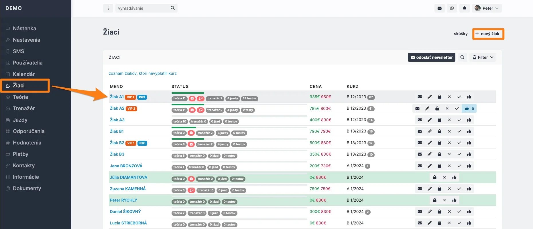 V pravo hore môžete pridať nového žiaka. O niečo nižšie je filter pre zobrazenie žiakov (napr.: zobrazíte si len žiakov jedného kurzu), vyhľadávanie a možnosť poslať newsletter/email zobrazeným žiakom.